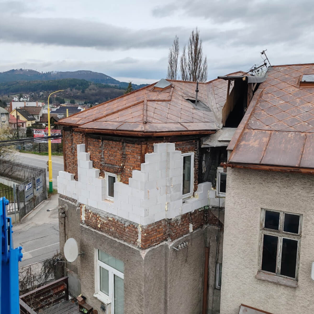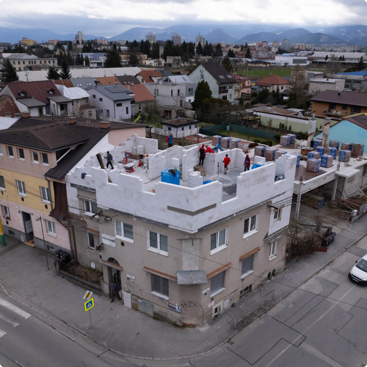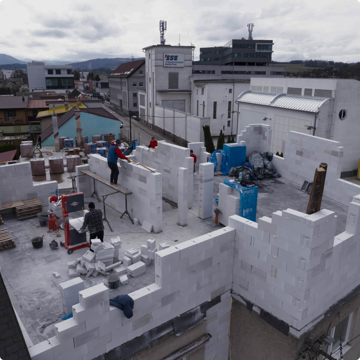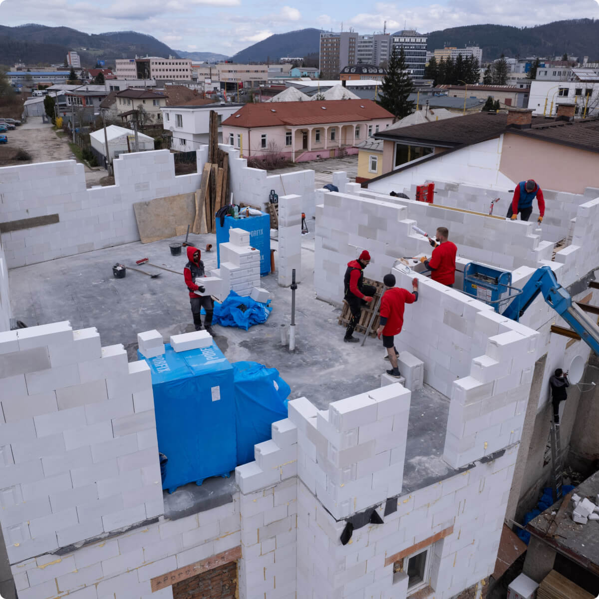 MAUERN VOM 2. OBERGESCHOSS, BAUEN DER SCHALUNG, VORBEREITUNG DER EISENKONSTRUKTIONEN FÜR DEN BETONKRANZ